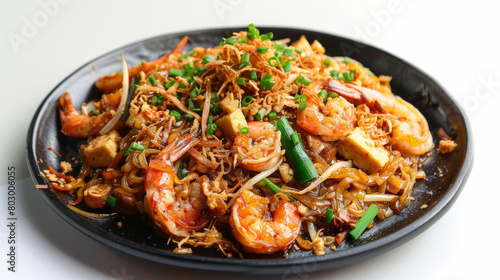 Savory malaysian char kway teow with prawns, bean sprouts, and tofu on a black plate against a clean white backdrop