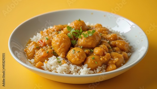 dish, rice, curry, ball, vegetable, sauce, meal, plate, food, delicious, tasty, healthy, homemade, serving, eatery, cookery, indian, south, asian, deliciously, appetising, savoury, spicey, yellow, orange, white, closeup, topview, modern, contemporary, vibrant, bright, colourful, fresh, light, dinner, lunch, portion