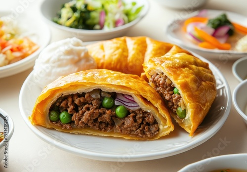 Savory Meat Pastries with Ground Beef, Peas, Onions, and Flaky Pastry Crust Served with Fresh Side Dishes in Asian Cuisine Setting