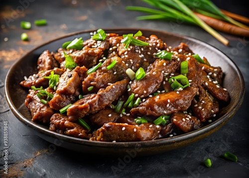 Savory Mongolian Beef strips tossed with crunchy green onions, crispy sesame seeds, and soy sauce glaze, moody dark tones, low-key lighting, intimate close-up shot.