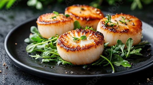 Savory roasted sea scallops served with greens on a dark background showcasing an exquisite gourmet dish