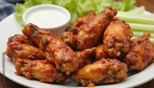 Savory spicy chicken wings served with celery sticks, creamy ranch dressing on white plate. Delicious finger food perfect for appetizers, snacks, parties, game day gatherings. Enjoy mouth-watering