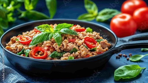 food, cooking, meal, dish, frying pan, fresh, basil, tomatoes, pepper, greener, ingredient, culinary, kitchen, favor, preparation, herb, meat, dinner, lunch, vibrant, healthy, cookery, served, natural, epicure, receipe, snack, wholesome, alimentary, spicey, garnish, aroma, plate, wooden, table, closeup, colourful, surface, organic, interesting, fresh produce, lifestyle, creativity, indulgence, delicious, warmth, comfort
