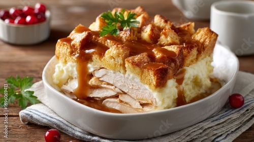 Savory turkey and mashed potato casserole with gravy in rustic setting dishware. Layered casserole with turkey, stuffing, mashed potatoes, and gravy, in baking dish. Comfort food concept