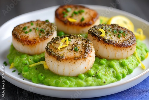 Scallop: A fine dining seafood delicacy. Grilled scallops served on a bed of green pea puree with lemon zest.