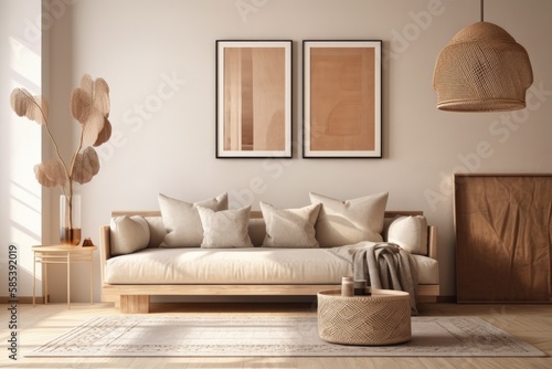 Scandi boho living room. Picture frame on blank wall. illustration Japanese warm beige. Generative AI