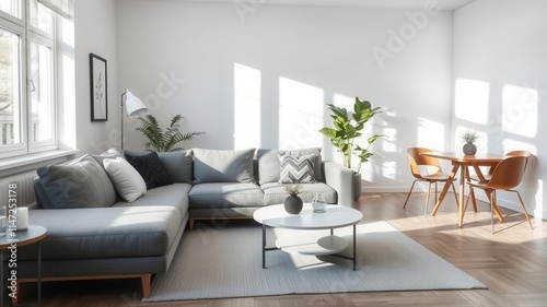 Scandinavian apartment interior with a comfortable grey couch, surrounded by minimalist decor and natural light, modern, interior