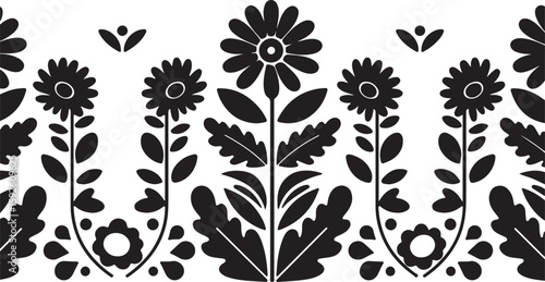 Scandinavian folk floral motif, horizontal divider with symmetrical daisies and leaves, Adobe Illustrator Artwork