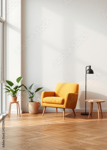 Scandinavian indoor design warm toned living room interior wall mockup with a yellow armchair and a background of a white wall green plants ai generative Empty room interior design Ultra realisti