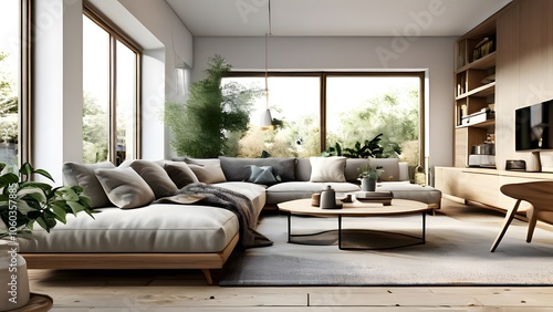 living room, cosy, interior, minimalist, decor, plant, natural, sunlight, scandinavian, ai