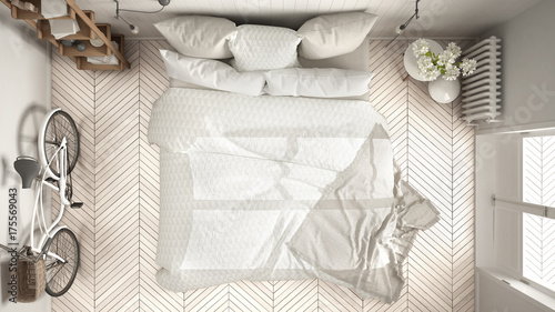 Scandinavian minimalist bedroom with big window and herringbone parquet, white interior design, top view