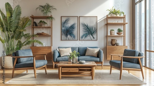 Scandinavian style living room interior featuring a sofa and two armchairs a shelf and drawer and a coffee table adorned with art decoration on hardwood flooring Panoramic window included 3D rende