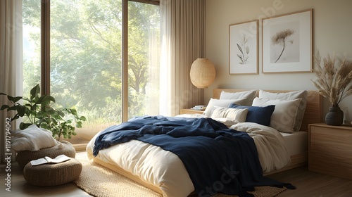 Scandinavian-inspired bedroom with navy throws, cream walls, and light wooden furniture, serene and airy