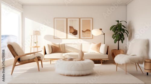 Scandinavian-style living room with light walls, sheepskin rug, and mid-century modern furniture pieces.