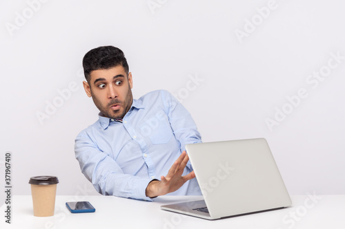 Scared frightened man employee sitting office workplace, showing stop to laptop screen with video call, looking terrified, afraid to watch horror content. studio shot isolated on white background