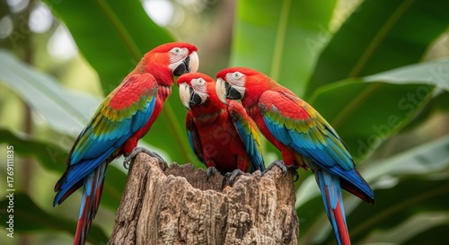 Scarlet Macaws on Tree Stump: Vibrant Plumage, Tropical Birds