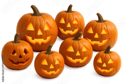Scary carved Halloween pumpkin set with glowing candles isolated on pure white background floating shadows seasonal spooky clipart for invitations and posters