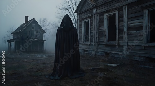 Scary ghost in a hooded cloak on the background of a lonely ruined house in the fog. Abandoned haunted house scene as spooky Halloween concept. Generative AI