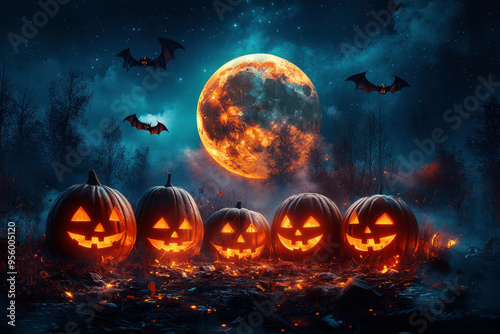cemetery, evil, fear, horror, halloween, night, pumpkin, holiday, background, scarey, skittish, october, light, celebration, dark, autumn, bat, haunted, mystery, gothic, illustration, card, concept, design, fall, house, sky, wood, wooden, ghost, jack, moon, poster, silhouette, grave, art, black, blue, orange, forest, tree, grunge, seasonal, copy space, lantern, symbol, glowing, invitation