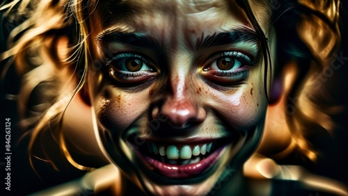 scary smile : portrait of a person with a Intense smile of a young woman with an expressive
