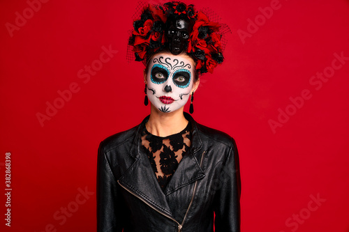 Scary young creepy lady calavera. wears artistic make-up for the feast of all the dead.Wears black leather jacket and lace gloves, dressed as skeleton isolated in red.