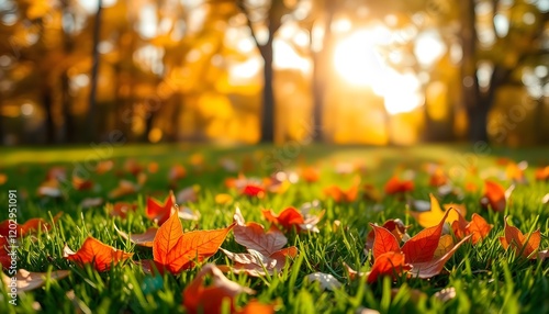 Scattered Autumn Leaves on Lush Grass Bathed in Warm Golden Light