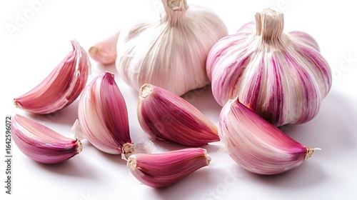 Scattered garlic cloves with earthy textures on a white surface, captured using DSLR and EF 50mm lens, flat lay composition with soft lighting