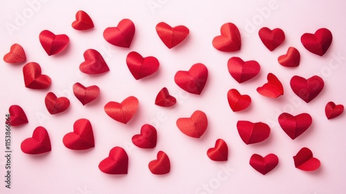 Scattered red paper hearts on pink background.