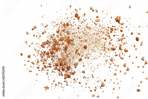 Scattered soil particles forming a starburst pattern in mid-air, set against a white backdrop