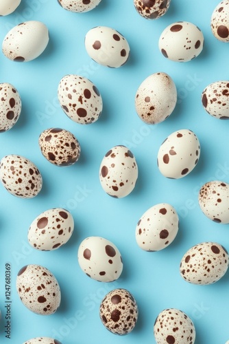 Scattered speckled quail eggs on blue background, overhead shot, Easter design