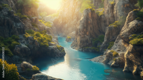 Scenic Aerial View of a Serene River Flowing Through a Majestic Canyon at Sunrise