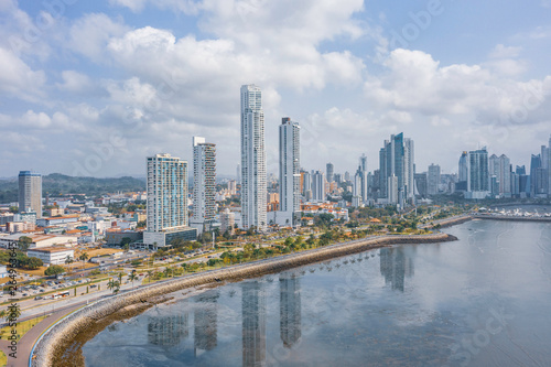 Scenic aerial view of downtown of capital of Panama. Beautiful cloudy look of skyscrapers on coastline of Pacific ocean in Panama-City. Shot of hightech megapolis in small country in Caribbean sea