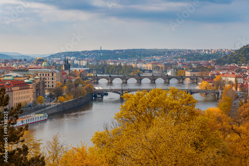 Scenic aerial view of the Old Town architecture and bridge over Vltava river in Prague, Czech Republic. Trees of the park at the foreground, fall time