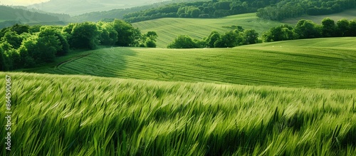 Scenic and lush green cereal field providing a healthy source of natural, fiber-rich food, with a picturesque view showcasing abundant beauty against a natural backdrop of greenery, ideal for a copy