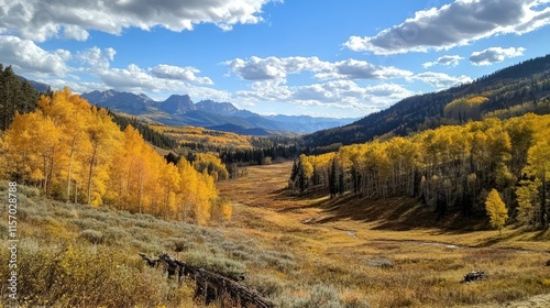 Scenic Autumn Landscape with Vibrant Fall Foliage and Majestic Mountains Under a Bright Blue Sky