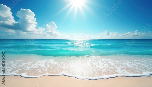 Scenic beach with clear blue water, sunny sky. Calm ocean waves crash white sand shore. Perfect holiday, vacation background. Summer travel to relax, enjoy tropical paradise.