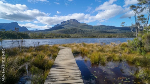 Scenic boardwalk along the edge of a serene lake with mountains in the background in Tasmania