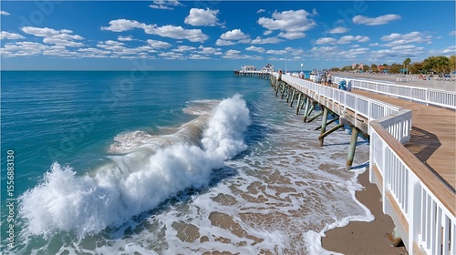 ocean, wave, pier, boardwalk, coastline, shore, water, cloud, sky, horizon, calmness, travel, summer, vacation, landscape, nature, beauty, marin, sea, scenic, leisure, recreation, sunny, wood, oceanfront, peaceful, tour tourism, blue, environment, picturesque, relaxing, panoramic, scenic view, sunlight, coastal, beach, aquatic, tropical, vacation spot, weather, serenity