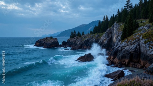 coast, ocean, wave, cliff, pine tree, scenic, nature, seascape, rugged, blue water, shoreline, rock, forest, landscape, dramatic, peaceful, evening, misty, horizon, natural beauty, wild, remote, calmness, powerful, lush, maritime, serene, vista, untouched, tidal, adventure, overcast, surf, wilderness, refreshing, environment, majestic, calm