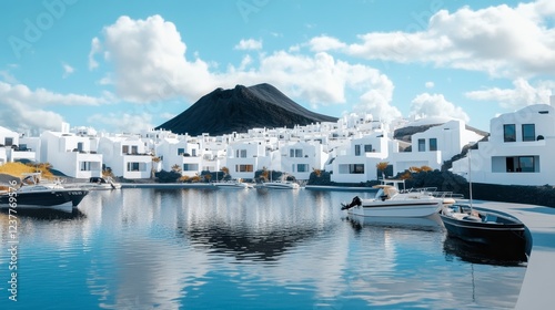 Scenic Coastal Village with White Houses and Mountain Backdrop