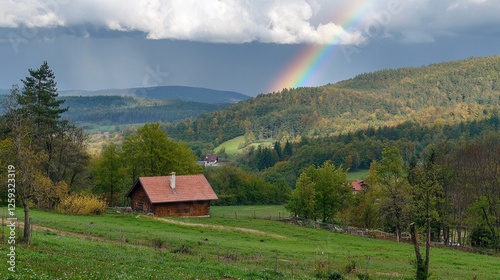 rainbow, landscape, cabin, countryside, hill, nature, cloud, greenery, calmness, rural, sky, forest, autumn, peaceful, scenic, bright, colourful, weather, sunlight, field, agriculture, travel, adventure, exploration, wildlife, serenity, environment, beauty, picturesque, vibrant, horizon, view, scenery, mountain, foliage, seasonal, heritage, relaxation, escape, retreat, natural, idylli, atmospheric, diverse, panoramic, charme