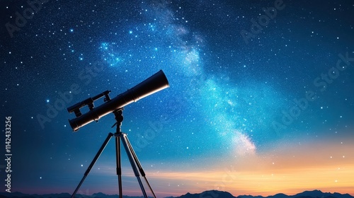 scenic, deck, workspace, telescope, laptop, serene, astronomy, sky, chaos, ar, raw, galaxy, profile, style, v, space, science, universe, discovery, job, id, exploration, night, earth, cosmos, star, tripod, silhouette, way, observe, moon, planet, hobby, solar, nebula, outer, system, lactic, illustration, nature, atmosphere, twinkle, expanse
