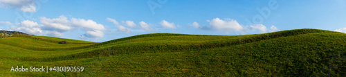 green, grass, pasture, field, summer, scenery, scenic, picturesque, panorama, banner, clean air, meadow, land, calm, silent, idylli, blue skies, countryside, space, freedom, agriculture, rural, highland, mountain, cloud, vibrant, season, farm, farming, field, landscape, panoramic, billboard, vista