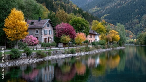 Scenic Lakeside Village with Colorful Autumn Trees Reflections in Austria Idyllic Homes against Mountain Backdrop Serene Waterscapes Picturesque Landscape Scene