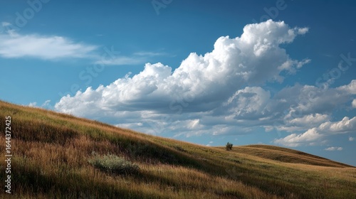 Scenic landscape of rolling grassy hills under a bright blue sky with dramatic white cloud formations du daytime, showcasing natural beauty and open countryside