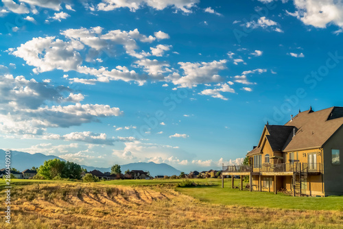 Scenic landscape with homes on a grassy terrain under blue sky and clouds