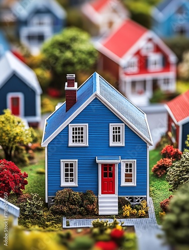 Scenic Miniature House with Blue Siding and Red Door in Lush Suburb : Generative AI