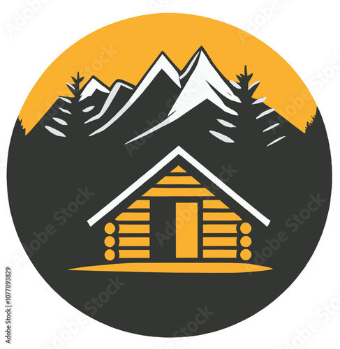 mountain, cabin, logotype, rustic, log, pine tree, snow-capped, peak, circular, design, orange, black, scenic, nature, wilderness, adventure, outdoors, hiking, retreat, filed, emblem, symbol, vector, silhouette, forest, get-away, serene, travel, illustration, graphic, art, tranquil, peaceful, alpine, tour tourism, cosy, hideaway, exploration, branding, abstract, wild, escapade