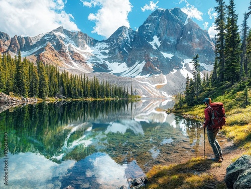 mountain, landscape, lake, forest, sky, cloud, hiking, nature, water, scenic, pine, traveler, adventure, tranquil, summer, sunlight, calmness, peak, travel, tour tourism, scenic view, beautiful, wilderness, ecology, serenity, clear, exploration, environment, picturesque, natural beauty, breathtaking, green, blue, hiking trail, scenic beauty, camp, remote, journey, wildlife, summer day, vibrant, peaceful