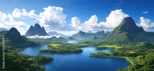 Scenic mountain landscape with lake view clear sky and white clouds nature scenery